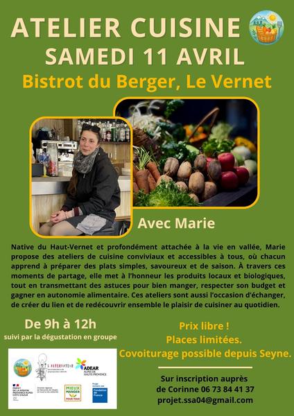 Native du Haut-Vernet et profondément attachée à la vie en vallée, Marie propose des ateliers de cuisine conviviaux et accessibles à tous. À travers ces moments de partage, elle met à l'honneur les produits locaux et biologiques, tout en transmettant des astuces pour bien manger, respecter son budget et gagner en autonomie alimentaire. Ces ateliers sont aussi l'occasion d'échanger, de créer du lien et de redécouvrir ensemble le plaisir de cuisiner au quotidien.