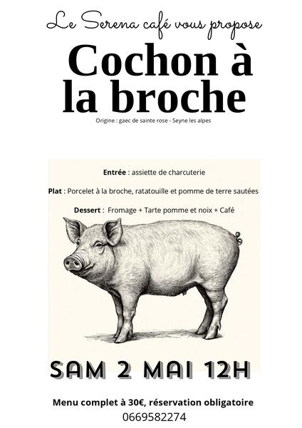 Le Séréna café vous propose un menu complet avec cochon à la broche, assiette de charcuterie, ratatouille, pommes de terre sautées, fromage, tarte pomme et noix, et café.